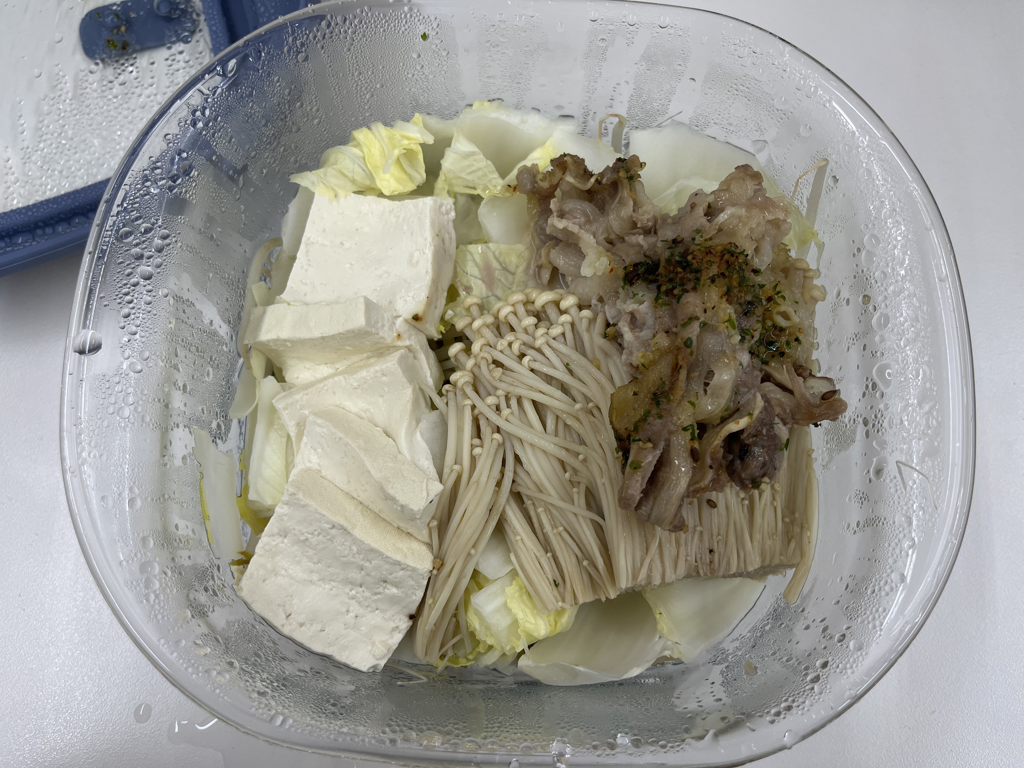1) 용기 바닥에 숙주를 깔고, 그 위에 알배추와 버섯을 올립니다.